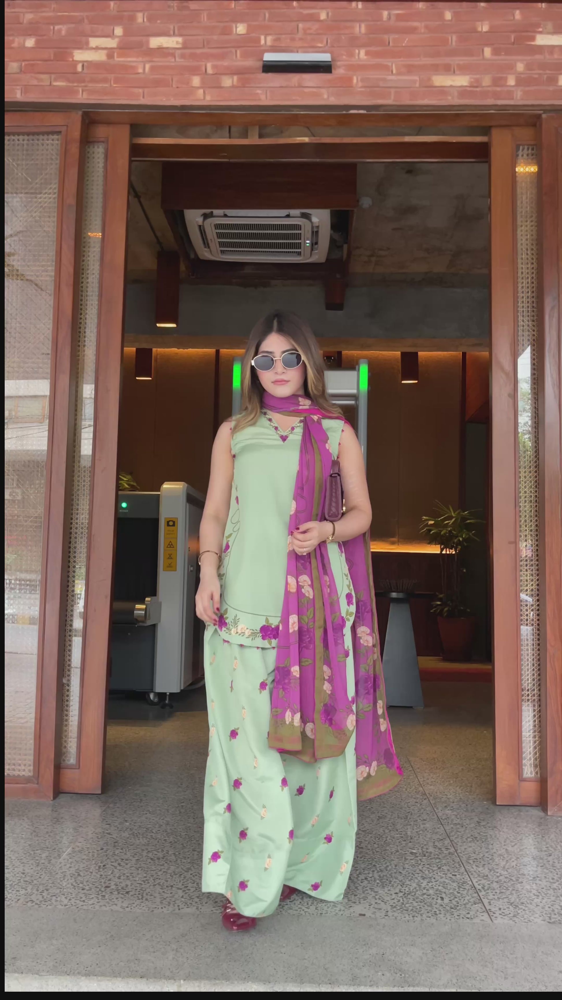 In serene celadon green, this silk lawn shirt with farshi shalwar features delicate floral prints and crystal bead handwork on the sleeves and daman. The voluminous silhouette nods to tradition, while a plum chiffon dupatta with pastel blooms adds a graceful contrast.