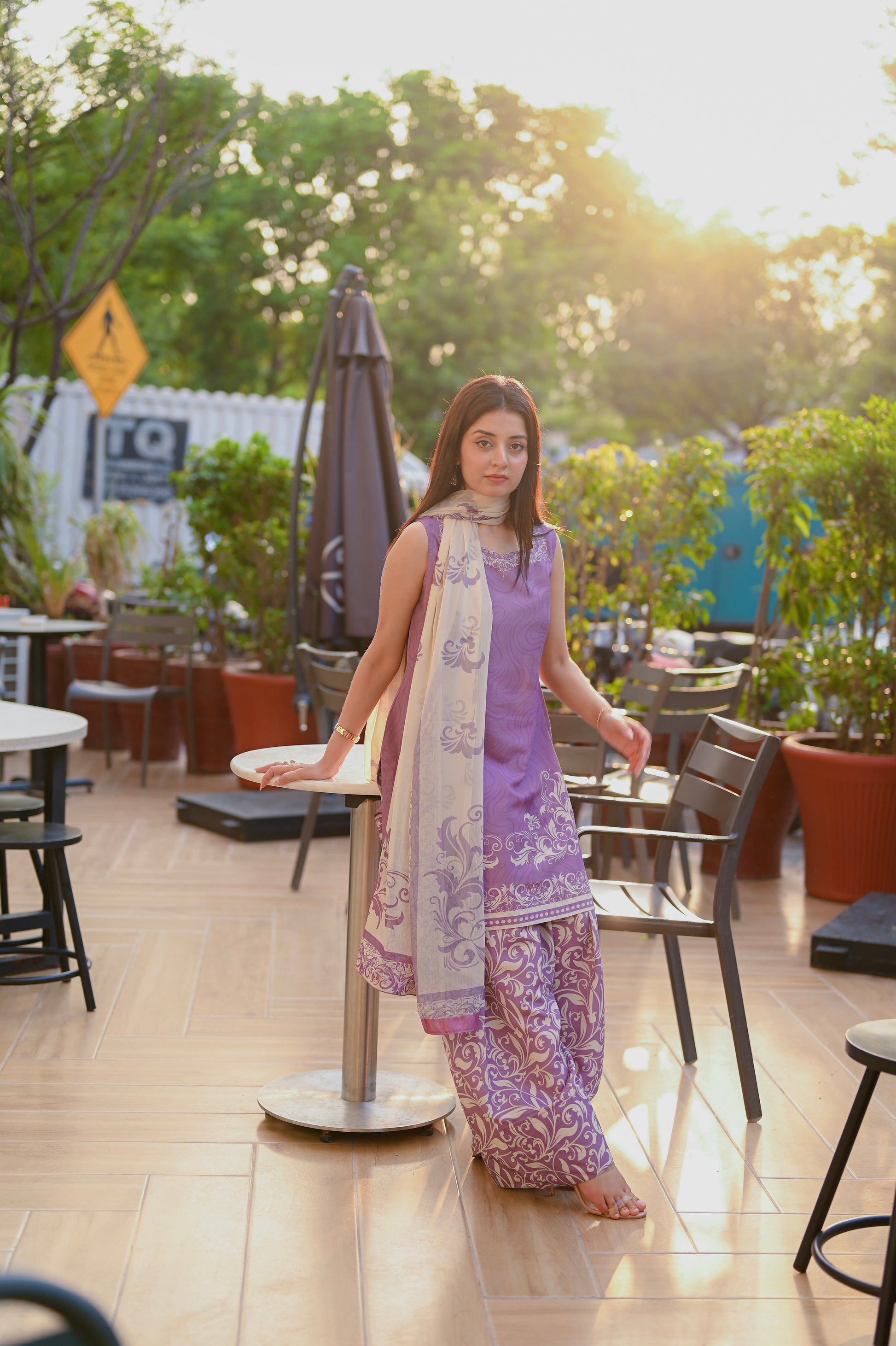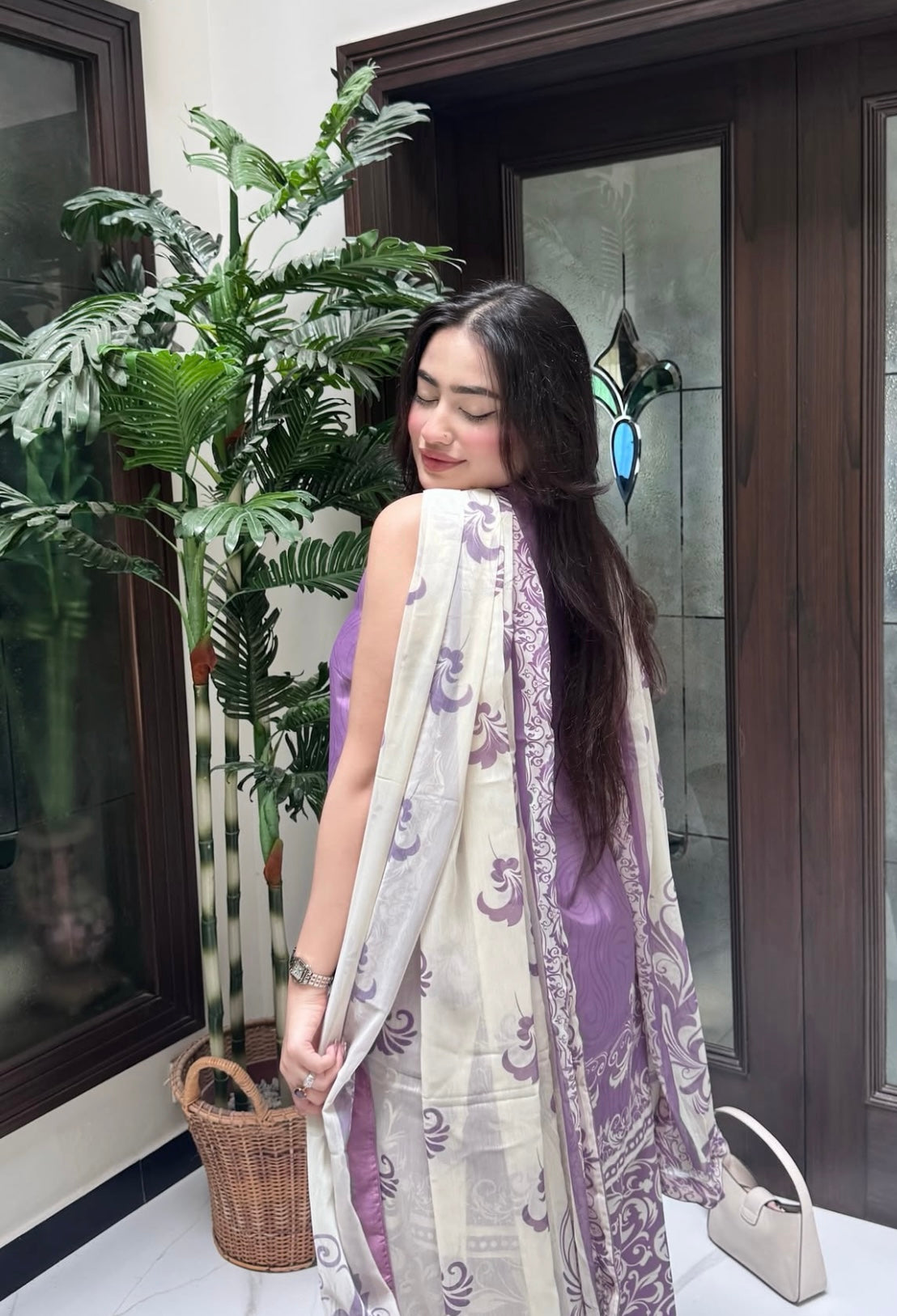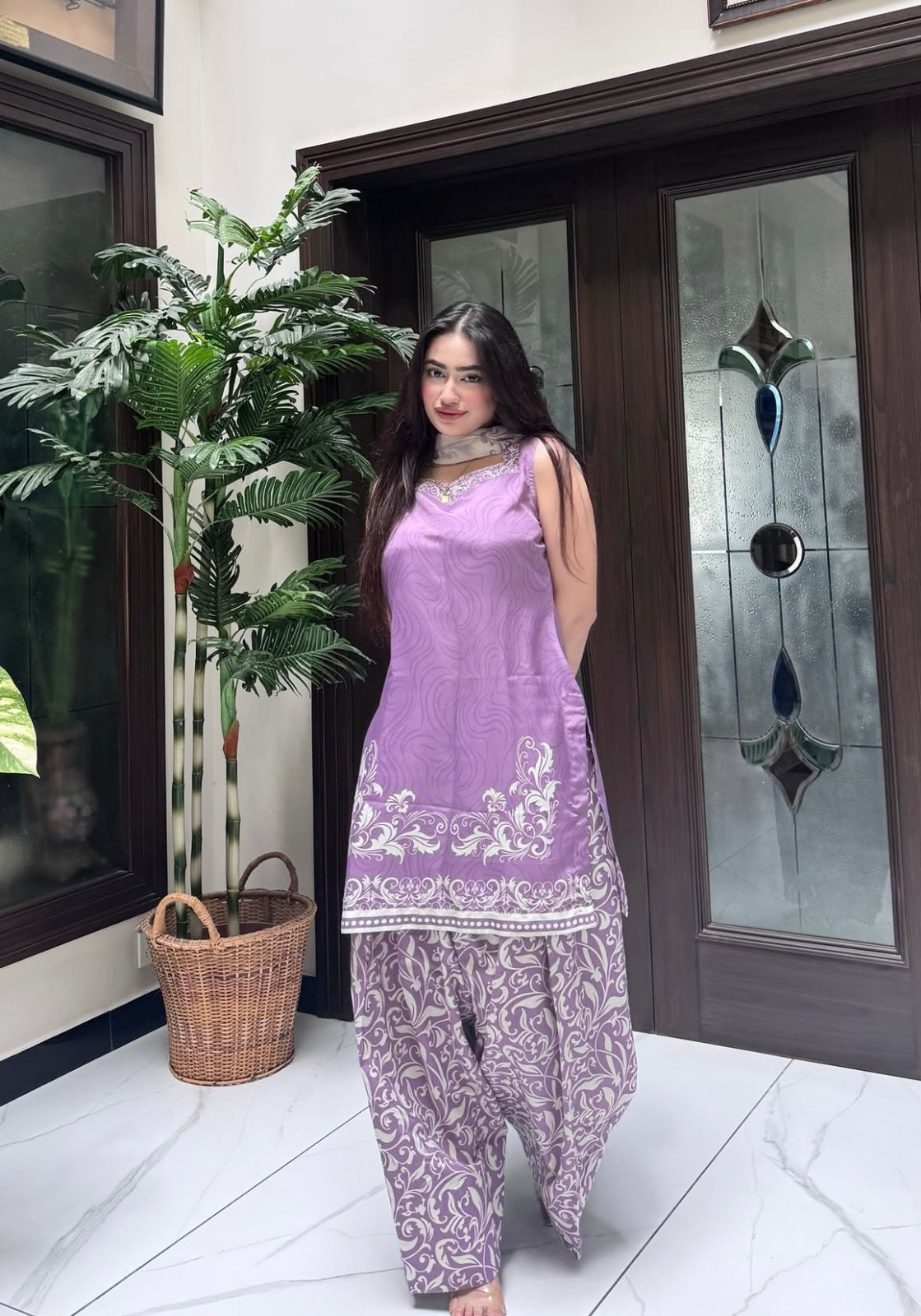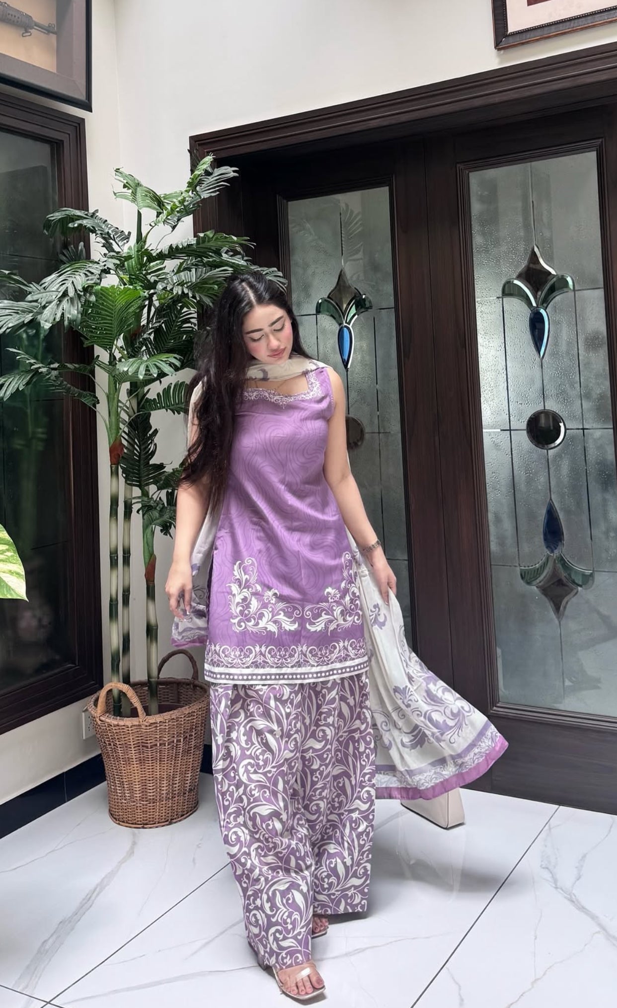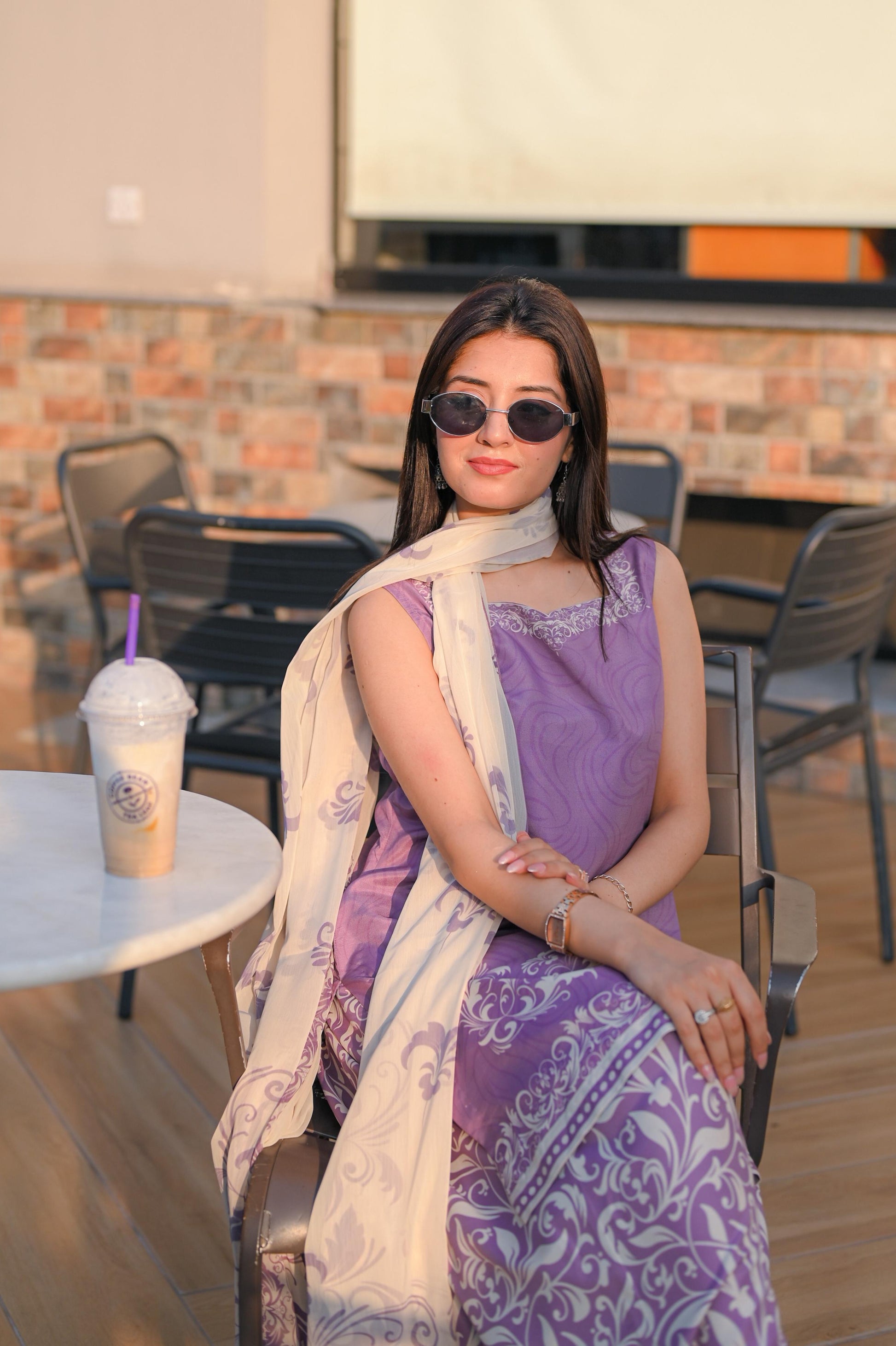 The soft lavender base with cream botanical prints pairs with a voluminous farshi shalwar and a flowy chiffon dupatta, striking the perfect balance of grace and tradition.