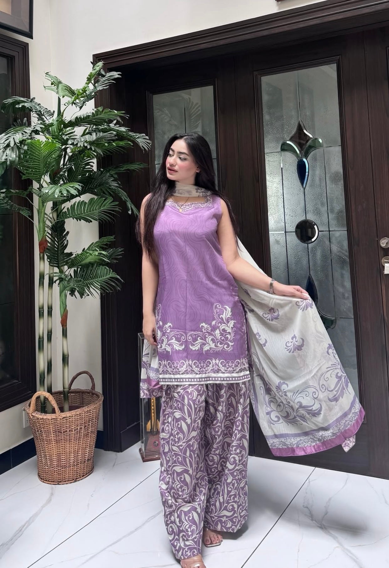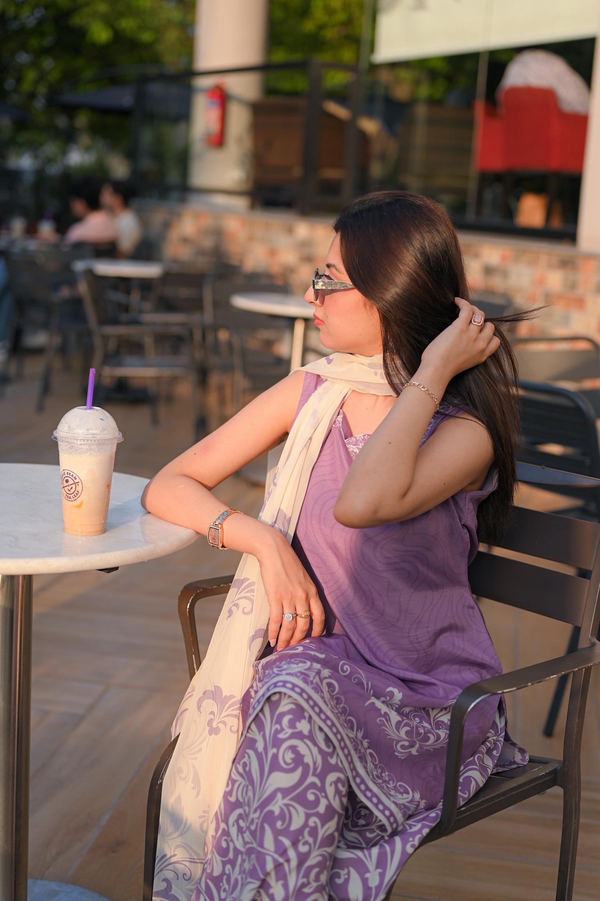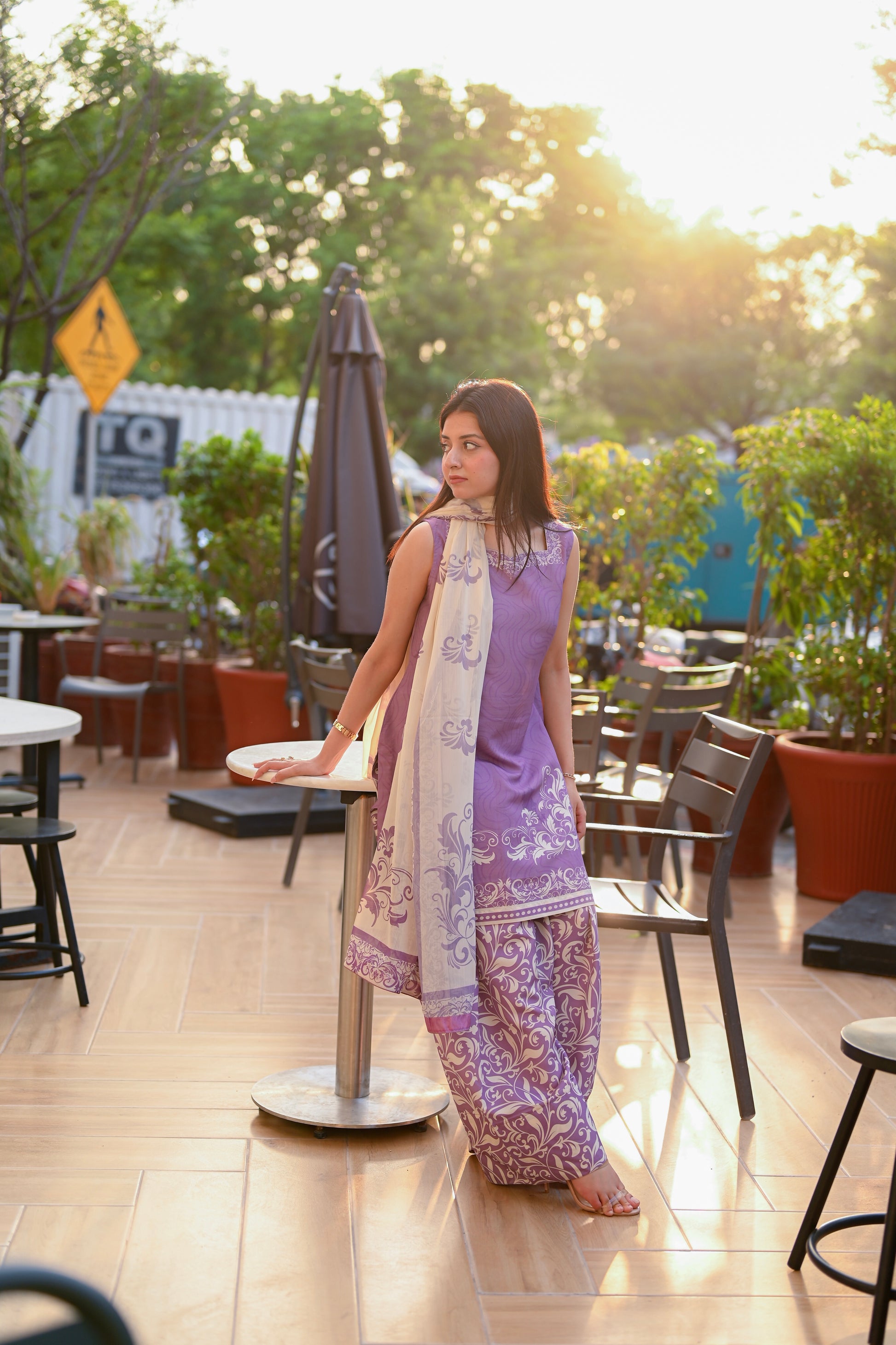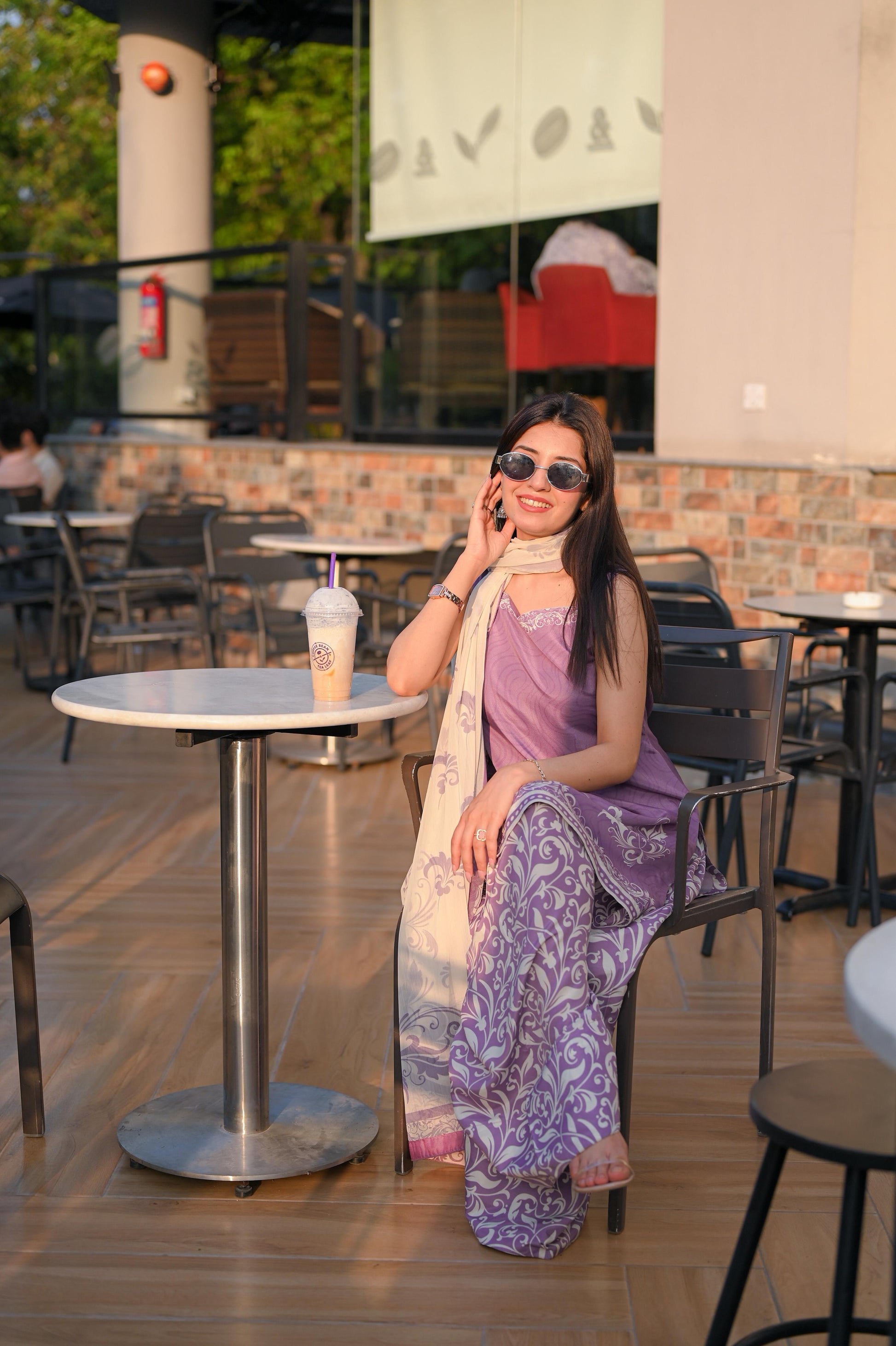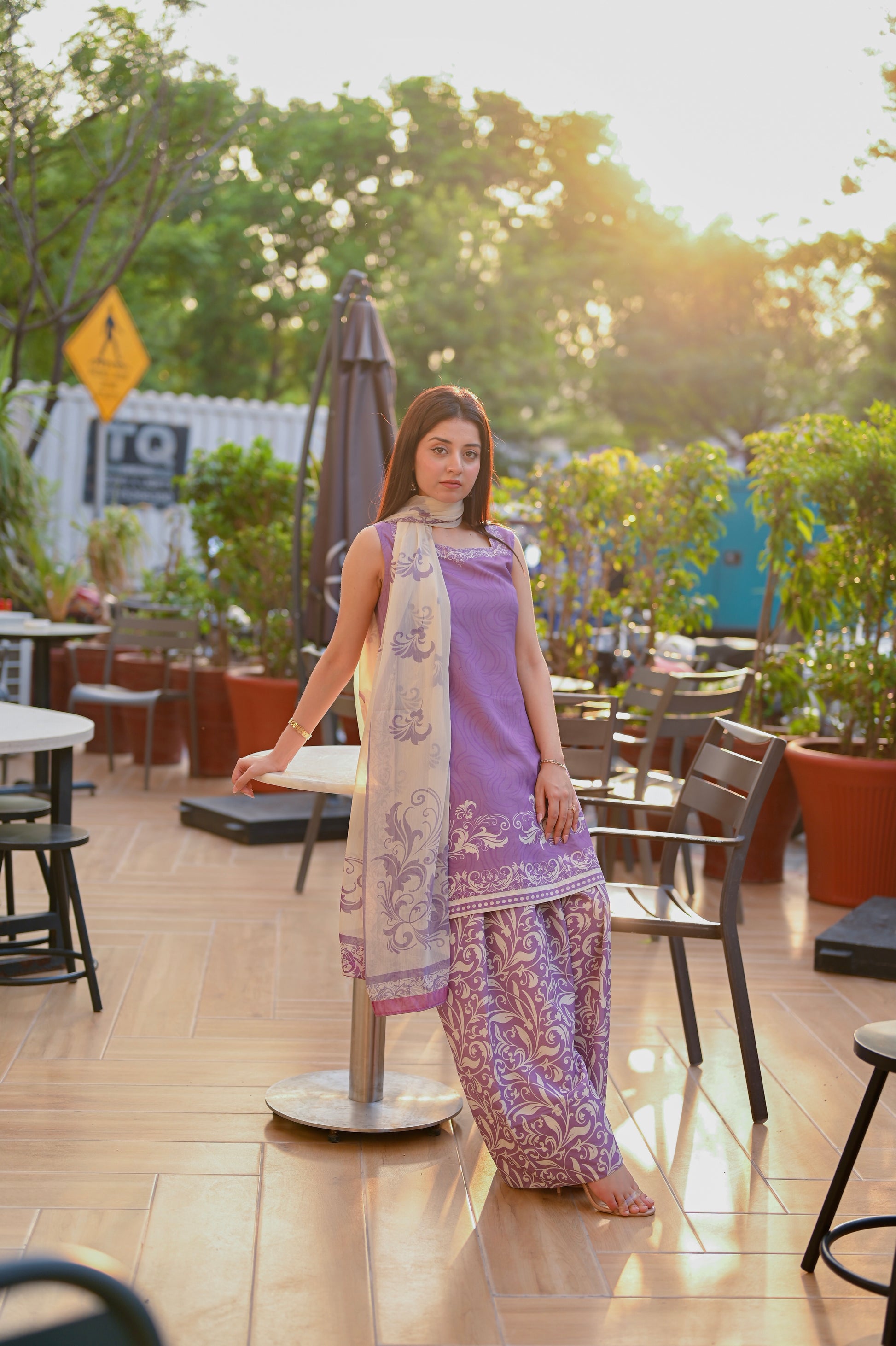 The soft lavender base with cream botanical prints pairs with a voluminous farshi shalwar and a flowy chiffon dupatta, striking the perfect balance of grace and tradition.