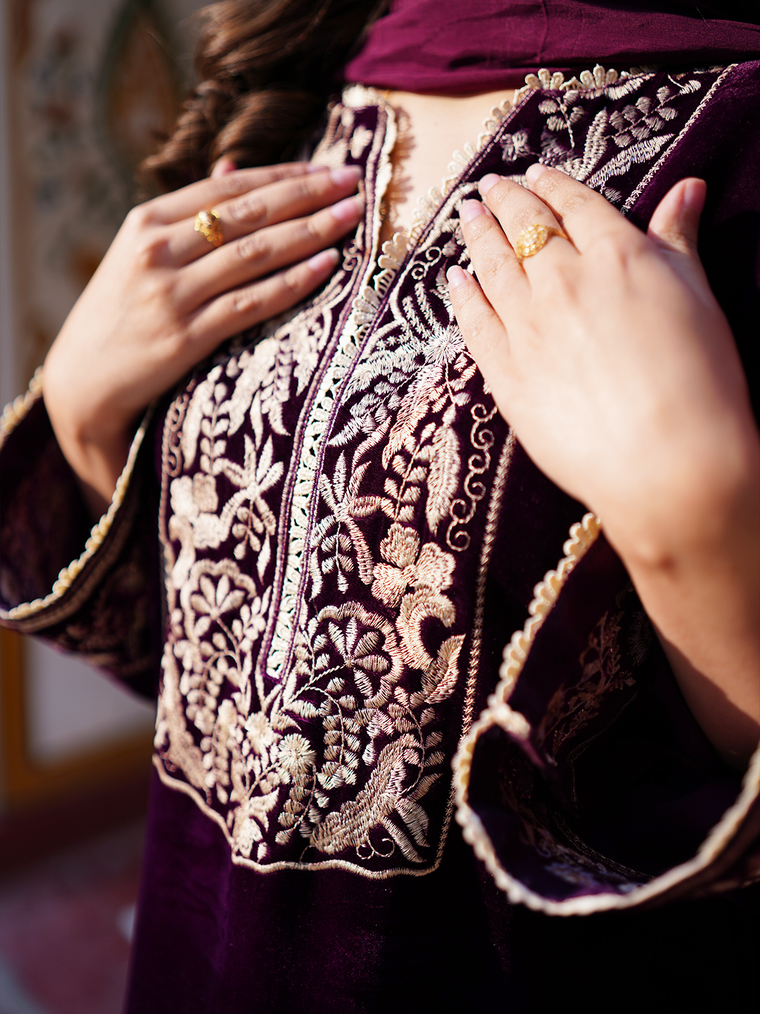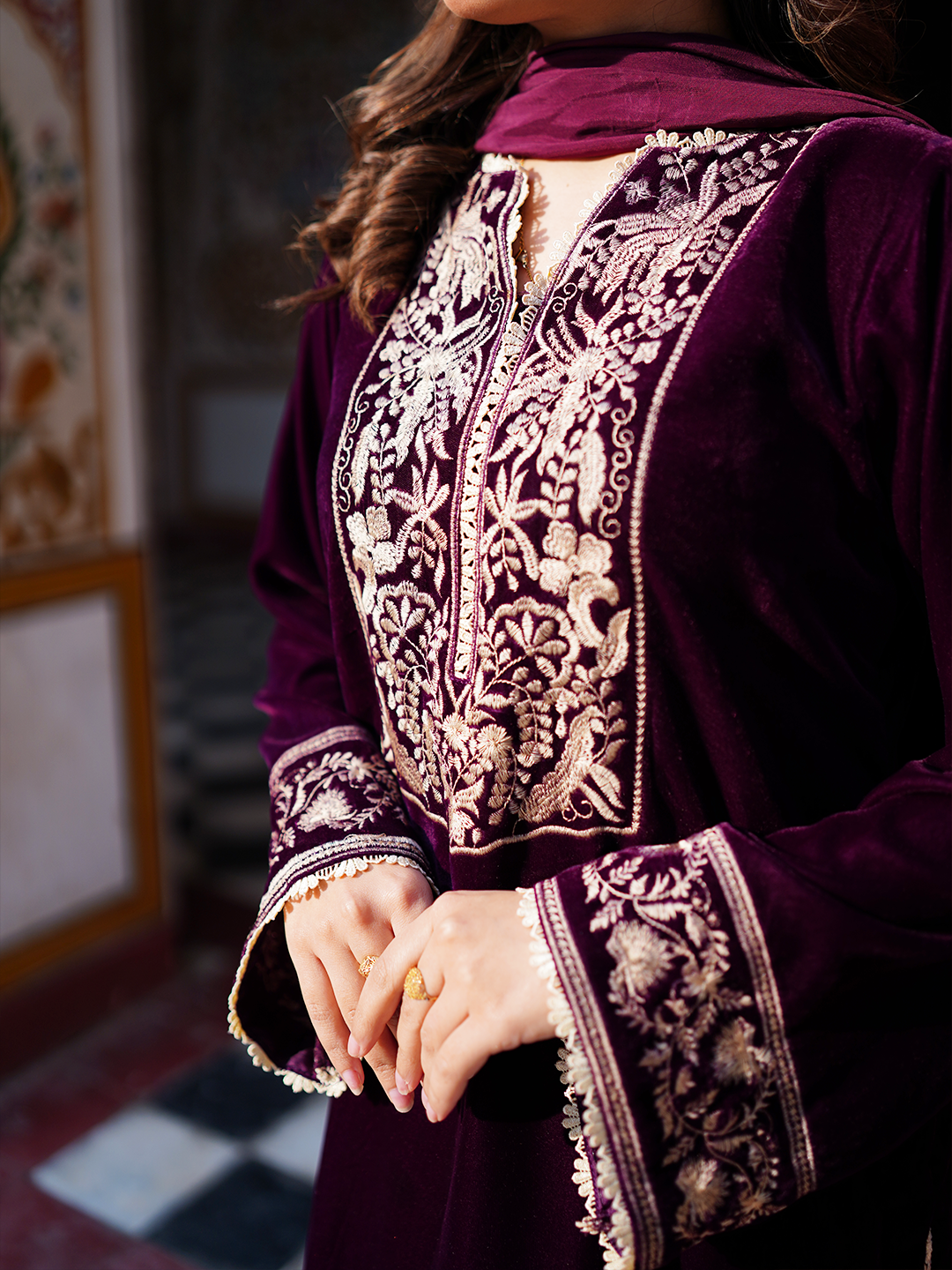 A 3-piece ready-to-wear ensemble crafted in plum micro velvet 9000, featuring a statement shirt and matching shalwar. The look is elevated with intricate embroidery on the neckline, sleeves, and daman, finished with delicate lace detailing. Paired with a medium silk dupatta adorned with lace borders, this outfit offers top-notch quality and timeless sophistication.
