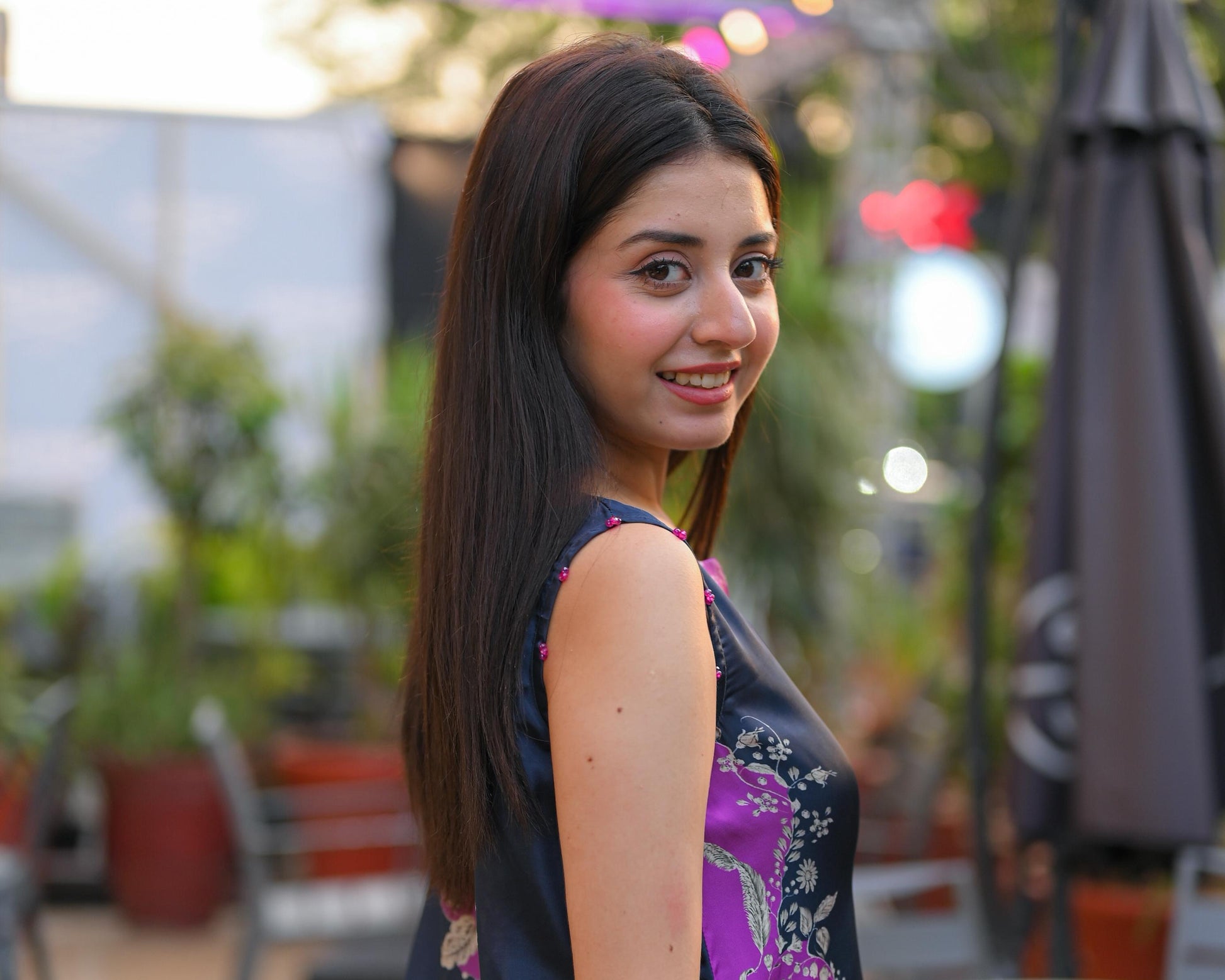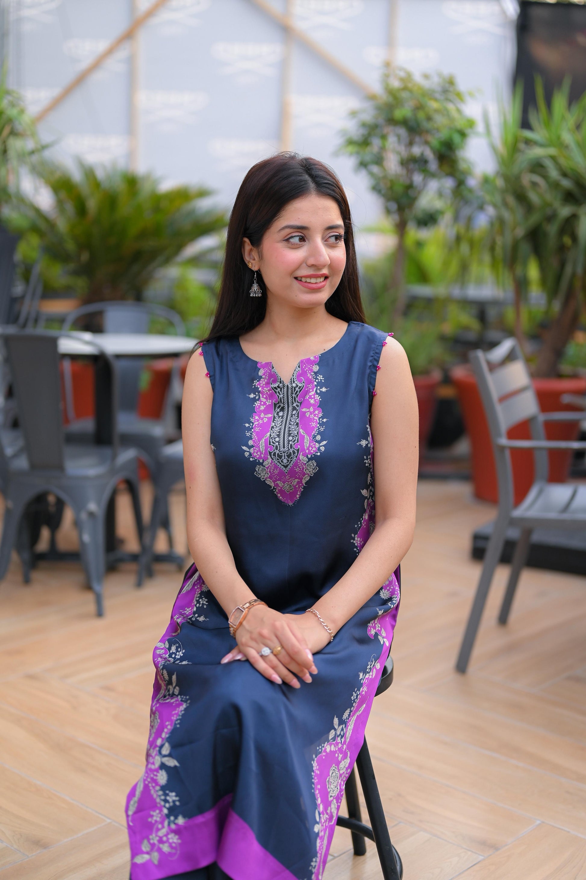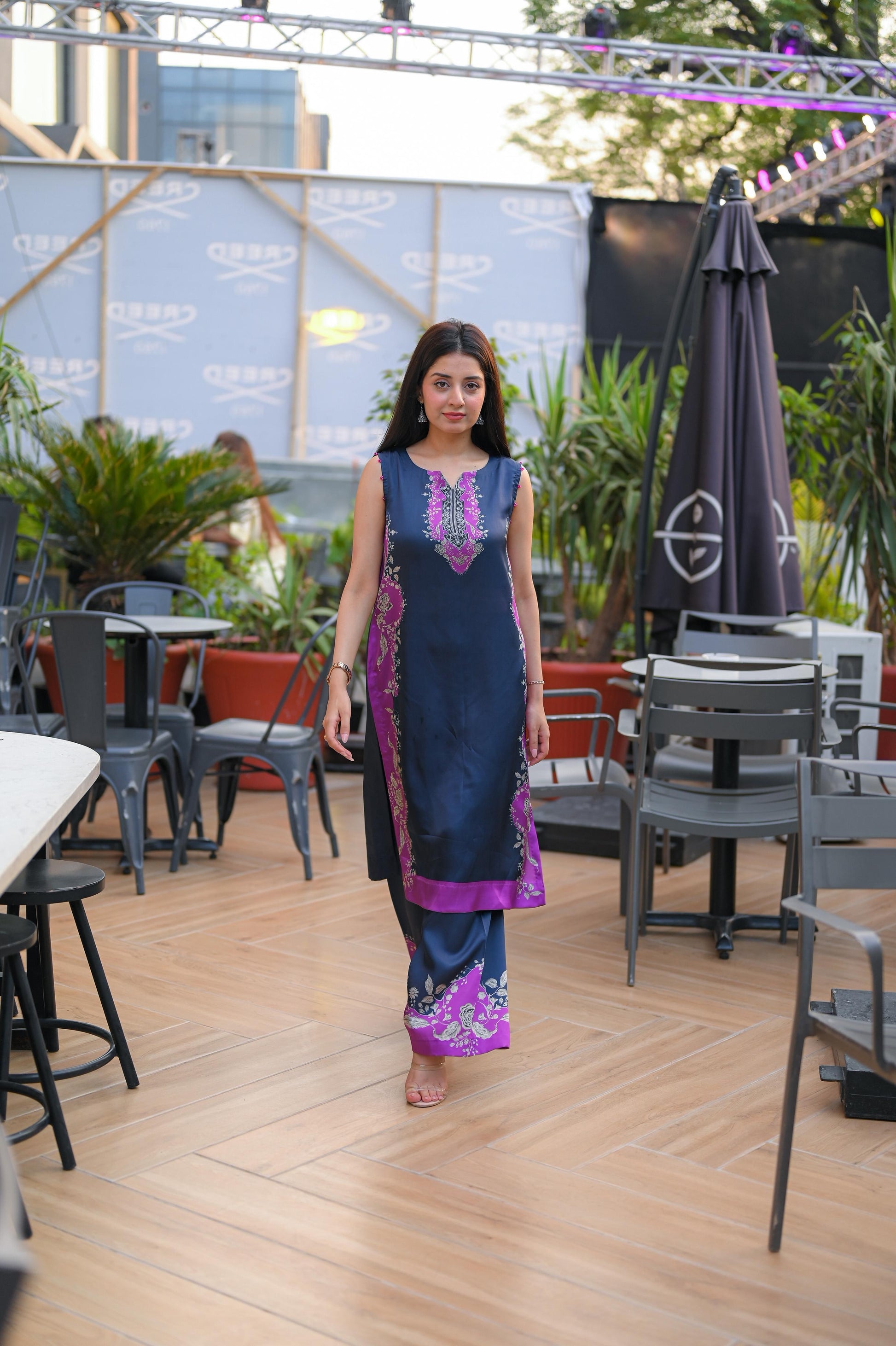 A long shirt with delicate pink crystal bead detailing on the sleeves, offered in both sleeveless and full-sleeve styles. Paired with wide-legged printed trousers featuring the same ornate border for a graceful flow.